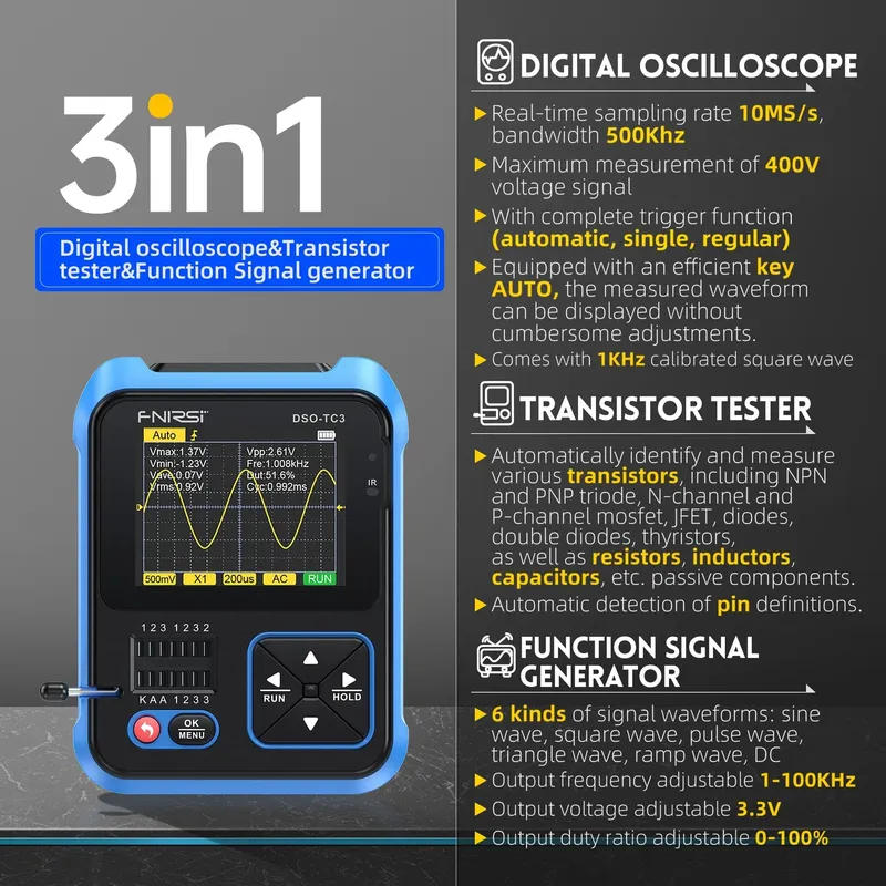 Мультифункциональный осциллограф-тестер-генератор FNIRSI DSO TC3 — это компактное решение, объединяющее в одном корпусе несколько критически важных инструментов для анализа, диагностики и прототипирования электронных схем. Оснащённый несколькими каналами осциллографа, встроенным генератором сигналов и мультиметром, TC3 позволяет вести полный цикл измерений без переподключений и смены приборов. Это особенно ценно в полевых условиях, на сервисных выездах и в небольших лабораториях, где важна мобильность без потери точности и функциональности. Гибкость панели управления и интуитивный интерфейс помогают быстро переходить от подключения к измерениям, экономя время на настройках и калибровке.